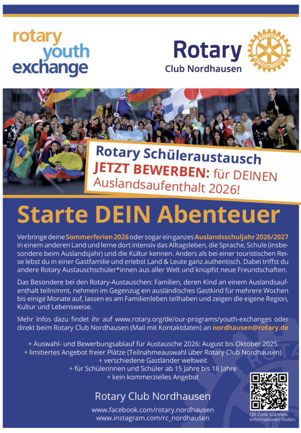 bis Oktober habt ihr die Möglichkeit, euch für das Schüleraustauschprogramm des Rotary Clubs Nordhausen zu bewerben. Das Programm eröffnet die Chance, entweder in den Sommerferien 2026 oder während eines ganzen Schuljahres 26/27 in einem anderen Land zu leben. Beim Leben in der Gastfamilie und dem Besuch der örtlichen Schule lernt ihr zugleich die Sprache, die Kultur und das alltägliche Leben kennen.