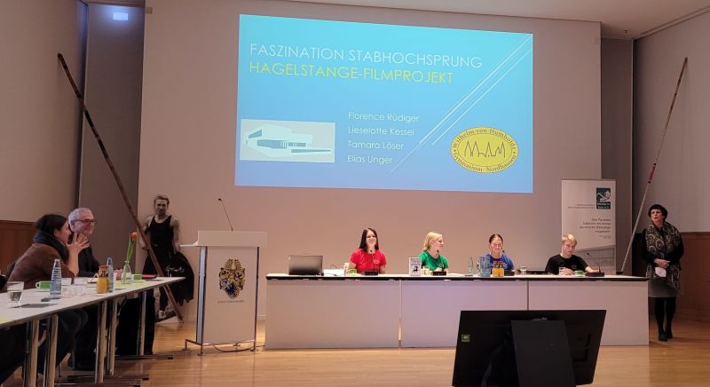 Während die letzten Impfpässe im Foyer noch kontrolliert werden, sitzen die Vertreter des Humboldt Gymnasiums, die vom Lesecafe´ der Rudolf Hagelstange Bibliothek eingeladen worden sind, um ihre preisgekrönte Arbeit, ein Beitrag für den Geschichtswettbewerb des Bundespräsidenten, vorzustellen nervös und warten ebenso wie ihr Publikum, bis der letzte Stuhl gefüllt ist. Auch der Oberbürgermeister, die Bürgermeisterin der Stadt Nordhausen, der Sportkoordinator des Kreises und ehemalige Hochspringer sind unter den Zuschauern. Der Raum ist ausgeschmückt mit Stabhochsprungstangen, Büchern und den vom Ministerpräsidenten Thüringens erstellten Urkunden.
