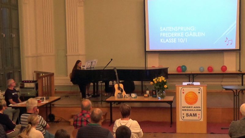 Musikalischen Glanz erhielt die „Sportass- -Ehrung“ durch „Saitensprünge“. Frederike Gäßlein 10/1 begeisterte mit ihrem ausdruckvollen Gesang. Allein am Klavier interpretierte sie den aktuellen James-Bond-Song „No time to die“. Begleitet mit der Gitarre durch ihren Vater wurde „When we where young“ zum emotionalen Höhepunkt der Show.