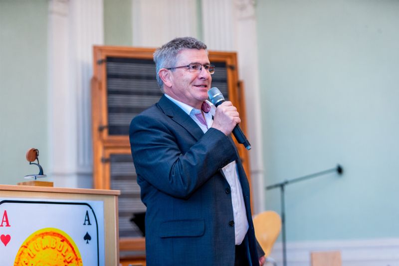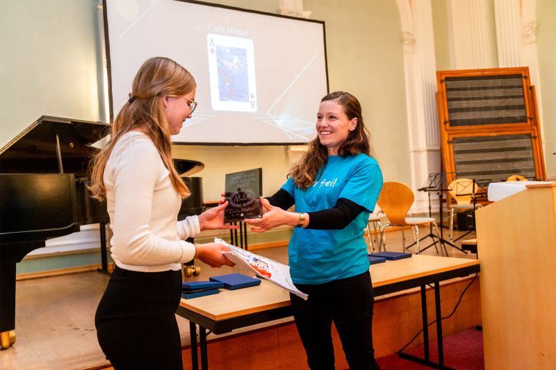 Ein weiterer Ehrungs-Höhepunkt war der Besuch unserer ehemaligen Schülerin Chantal Rimke. Nunmehr am Sportgymnasium Jena gelang ihr 2022 in Jerusalem der U18-Vizeeuropameistertitel im Kugelstoßen. Ein herausragender Erfolg, über den sich auch die Humboldtianer mitfreuten. Schülersprecher Georg Höpker interviewte Chantal in lockerer, informativer Sport-Studio-Manier und konnte die Sportlerin so den Gästen geschickt vorstellen. Chantal bekam einen Ehrenpokal mit silbernen und einer goldenen Schokokugel, als Glückwunsch auch für ihre sportliche Zukunft.
