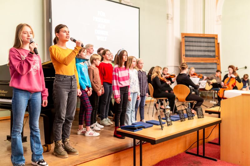 Als roter Faden zog sich der Wunsch nach Frieden durch das künstlerische Rahmenprogramm. Musikalischen Glanz bekam die Veranstaltung durch grandiose „Saitensprünge“ vom Humboldt-Chor & Streich-Ensemble unter der Leitung von Frau Mitzlaff und Frau Hart. Als Gesangssolistin begeisterte Carla Höpker, die sich selbst am Klavier begleitete. Unser Englisch-Mathe-Lehrer Herr Drobner beeindruckte im Duett mit der Sängerin der Band Bartlos Jana Freimann und dem Lindenberg-Klassiker „Wozu sind Kriege da“.