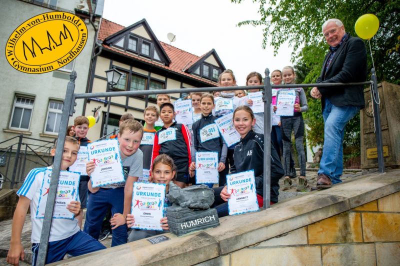 Unterstützt durch die Schulleitung und das Kollegium hat sich unser Gymnasium im stündlichen Wechsel mit allen 5.& 6. Klassen und ihren Sportlehrern aktiv beteiligen. Nach der anstrengenden, gemeinsame Überwindung der neuen Gehegetreppe in verschiedenen Bewegungsformen konnten 150 Schüler mit Stolz ihre individuelle Urkunde empfangen.