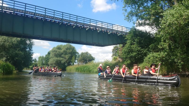 Mit einer dreitägigen Kanutour paddelte der WPU-Kurs nach zwei Jahren in sein „Naturwissenschaft und Technik und Sport“-Finale. In Wendelstein begann bei km 44 die erste, 16km lange, Etappe in 2er-Kajaks und führte an der Arche Nebra vorbei nach Karsdorf, wo, nach einem gewittrigen Start und Zieleinlauf, ein leckeres Abendbrot und Tipis auf die Flussfahrer warteten. In 10er-Schlauchbooten ging es am zweiten Tag von Karsdorf nach Laucha. Nach dem paarweisen Synchronpaddeln stellte das Koordinieren von zehn Fortbewegungsinstrumenten in einem Boot die nächste Herausforderung dar. Auch diese wurde schnell gemeistert. Schwimm- und Sprungeinlagen dienten vor allem des Sicherheitschecks der Schwimmweste, Staffel- und Geschicklichkeitsspiele verbesserten das Handling des Gefährts. Schließlich waren da noch die 4er-Kanadier, mit denen es von Laucha bis nach Naumburg in die Saale gehen sollte. Durch drei Schleusen und vorbei an Weinbergen, Sumpfschildkröten und der „Perle des Unstruttals“ Freyburg wurde die Flusslandschaft immer schöner und Stechpaddelführung, sowohl auf der Back- als auch auf der Steuerbordseite, zunehmend besser. Gruppendynamik wurde erneut groß geschrieben und die gute Laune saß auch am dritten Tag mit im Kanu. Ein letztes Mal die Rettungswesten testen und dem Unstrut-Wasser auf den Grund gehen, bevor der Südharz die Wasserratten zurück rief. Nur zum Geschichtelernen war „Mann“ dann doch viel zu müüüde.