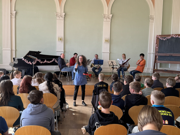 Mit seinen vielfältigen Angeboten schafft das TNLOS für Schülerinnen und Schüler tolle Erlebnisse. Dieses Mal war das Holzbläserquintett am 06.05. mit einen Programm "Musik beschreiben" in die 6. Klassen eingeladen. Unter Moderation der Konzertdramaturgin Katrin Stöck konnten die Klassen in einem 45-minütigen Konzert hautnah dabei sein und sich einbringen. Danke - hat Spaß gemacht!